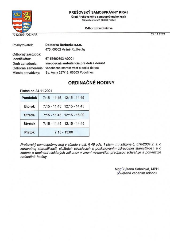 Od 01.12.2021 je v Podolínci v budove zdravotného strediska na 1. poschodí otvorená nová ambulancia pre deti a dorast - Doktorka Barborka s.r.o., ordinuje lekárka MUDr. Barbora Turlíková