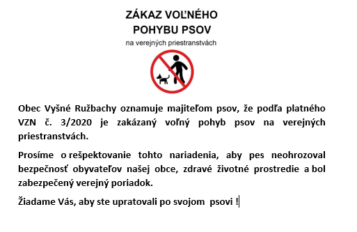 Obec Vyšné Ružbachy oznamuje majiteľom psov, že podľa platného VZN č. 3/2020 je zakázaný voľný pohyb psov na verejných priestranstvách.