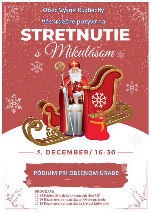 Dňa 5.12.2022 sme sa stretli s deťmi a ich rodičmi na oslavách sviatku svätého Mikuláša aj v našej obci. Spolu so starostom obce sme rozsvietili vianočnú výzdobu. Deti privolali Mikuláša hlasným skandovaním a ten prišiel so svojimi pomocníkmi – anjelmi a čertami na koči s konským záprahom. Na pódiu pri obecnom úrade si vypočul pesničky a básničky v podaní detí z materskej školy. Mikuláš mal pripravené sladké prekvapenie pre všetky detičky.