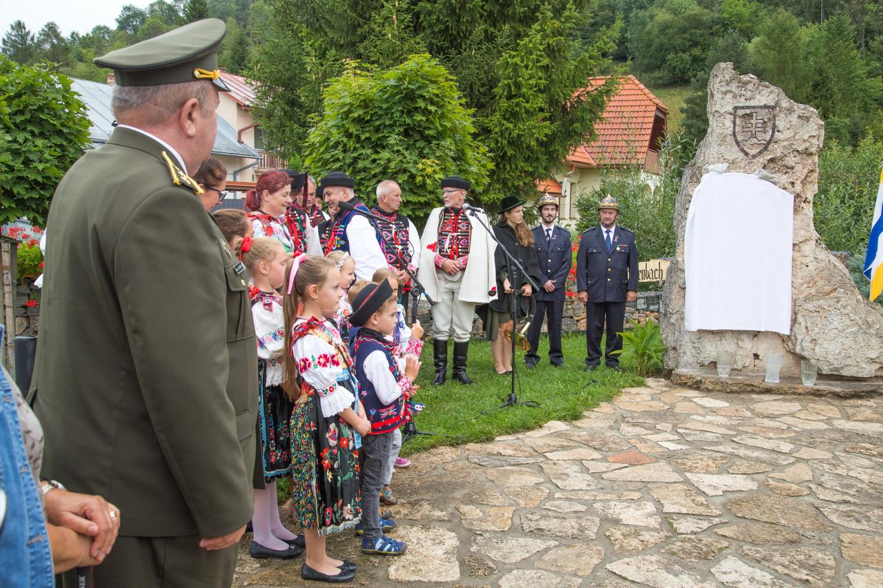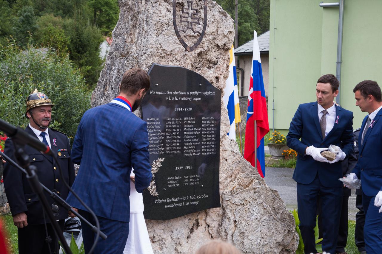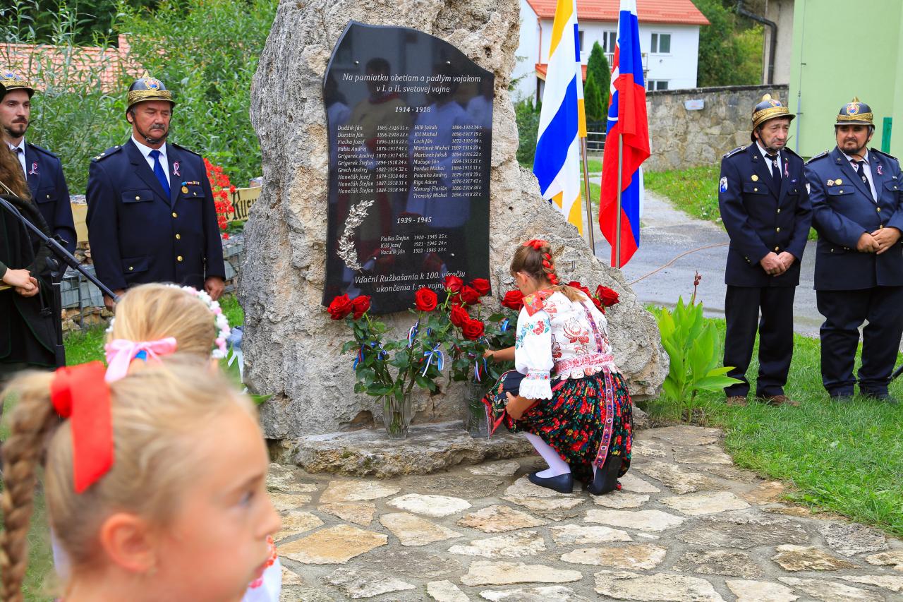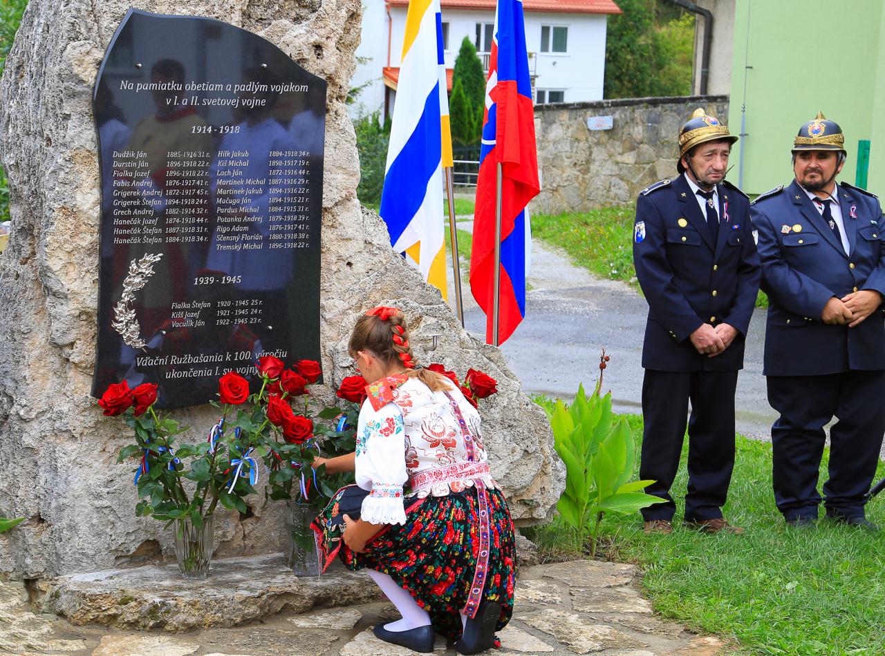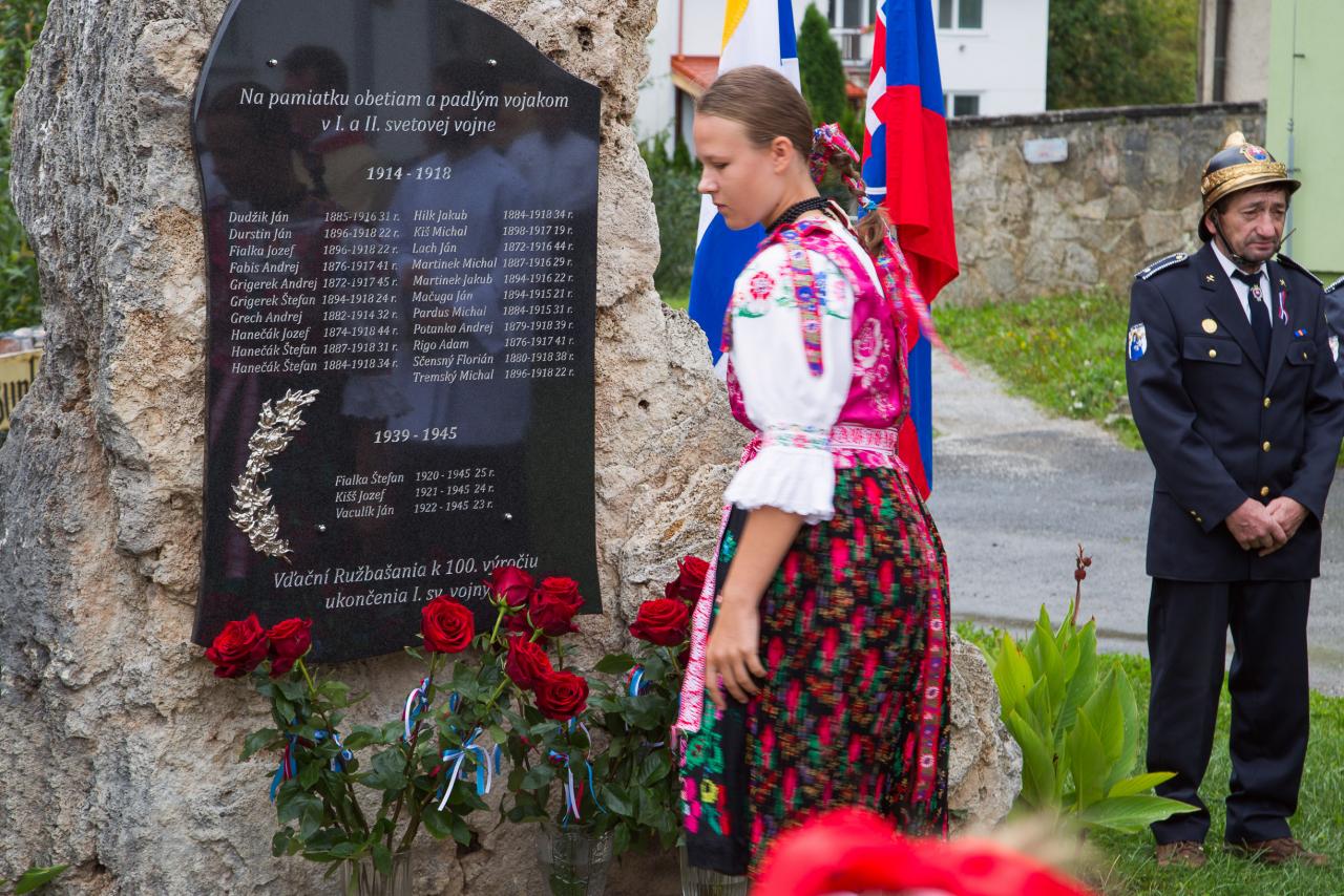 Slávnosť bola pripravená k 100 výročiu od ukončenia 1. sv. vojny, no svetová pandémia Corony zabránila jej pôvodnej realizácií a tak sa táto slávnosť uskutočnila s časovým oneskorením. Slávnosť začala slávnostnou sv. omšou v kostole Obetovania Pána, ktorá bola obetovaná za všetkých padlých vojakov vo svetových vojnách. Po nej nasledoval krojovaný sprievod detí, mládeže, mužov, žien a obyvateľstva do parku, kde sa uskutočnilo slávnostné odhalenie pomníka a pietny akt s odhalením mramorovej tabule s menami 24 vojakov – rodákov, ktorí zahynuli v I. a II. sv. vojne. Mramorová tabuľa je osadená v travertínovom brale, na vrchu ktorého je umelecky vykovaný štátny znak Slovenskej republiky. Počas slávnostného ceremoniálu boli účastníkom o všetkých vojakoch podané informácie o ich zaradení do príslušných vojenských útvarov a o miestach kde bojovali i zahynuli na rôznych svetových bojiskách. Informácie o nebohých vojakoch boli overené vo vojenských historických archívoch a matrikách. Zoznam vojakov je zaznamenaný i v Obecných kronikách z rokov 1933 a 1961. Získané dokumenty boli zverejnené počas slávnosti na výstavných paneloch v blízkosti parku. Počas pietnej spomienky za každého vojaka bola k pomníku položená červená šípová ruža. Starosta Obce Mgr. Peter Martinek a predseda OblV SZPB Ing. Václav Homišan v Starej Ľubovni vo svojich príhovoroch prejavili úctu, vďaku a česť padlým Ružbašanom i všetkým vojakom, ktorí zahynuli v dôsledku svetových vojen. Odhalenie pomníka padlým vojakom z 1. a 2. svetovej vojny 12 Ružbašské žrodelko Prítomní poslanci Obecného zastupiteľstva položili k tabuli veniec. Po odhalení tabule zazneli slávnostné fanfáry a za každého vojaka odznel úder na zvon. Program konferovali Andreja Bajnóczyová a Benjamín Fečík. V závere slávnosti miestny kňaz Ján Stašák požehnal pamätnú tabuľu. Počas slávnosti zazneli oslavné básne, vojenské, partizánske i goralské piesne v podaní členov miestnej speváckej skupiny. Slávnosť pokračovala sprievodom na cintorín k hrobu jediného vojaka z 1. sv. vojny ktorý je pochovaný na miestnom cintoríne. Obec i rodina nebohého vojaka Štefana Hanečáka prejavili úctu odhalením pamätnej tabule i položením venca priamo na jeho hrobe. Postavením pamätníka v parku v centre našej obce neďaleko kostola pribudla ďalšia významná dominanta symbolizujúca krutosti a temnú minulosť, ale i bolestivé spomienky na našich predkov. Česť ich pamiatke.