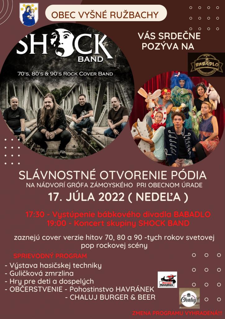 Obci sa podarilo vytvoriť s pomocou dotácie z Prešovského samosprávneho kraja aj z rozpočtu obce prístrešok – pódium, ktoré sme oficiálne uviedli „ do života „. Starosta obce Mgr. Peter Martinek spolu s pánom Petrom Fabisom prestrihli slávnostne pásku. Nedeľné popoludnie patrilo súťažiam pre deti, ale aj dospelých, ktoré pomohli zorganizovať členovia Dobrovoľného hasičského zboru Vyšné Ružbachy. Oko nielen malých zaujala výstava hasičskej techniky. Tváre detí skrášlila pani Ivanka Pappová, ktorá predviedla umenie maľovania na tvár. Deťom sa páčilo vystúpenie bábkového divadla BABADLO s hrou o Psíčkovi a mačičke. Pre tých starších večer zazneli svetové cover verzie hitov 70, 80 a 90 – tych rokov svetovej pop rockovej scény v podaní skupiny SHOCK Band. O občerstvenie sa postaral Hostinec Havránek a Chaluj Burger & Beer.