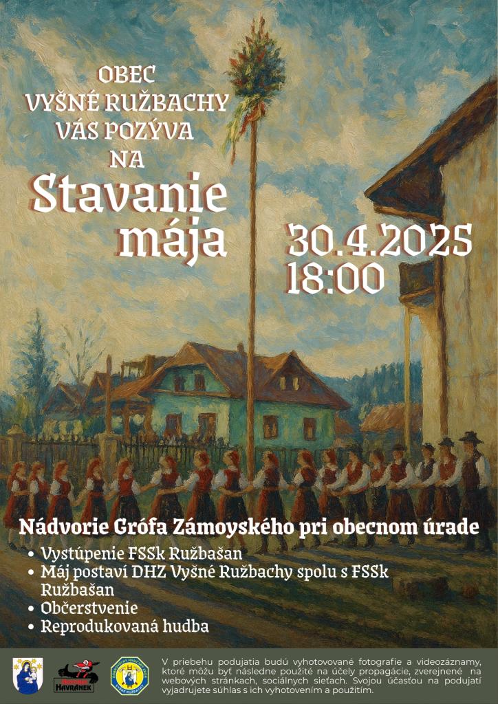 Obec Vyšné Ružbachy aj tento rok privítala máj tradičným spôsobom – postavením mája, ktorý nám priniesla a krásne ozdobila Folklórna spevácka skupina Ružbašan. O postavenie sa postarali naši dobrovoľní hasiči z Vyšných Ružbách, ktorým patrí veľká vďaka za ich prácu a ochotu. Následne sa o príjemnú atmosféru postarala folklórna skupina Ružbašan, ktorú v priebehu večera vystriedala mladá generácia z FSSK Ružbašan. Spoločne vytvorili krásny kultúrny zážitok plný piesní, tradícií a radosti. Obec Vyšné Ružbachy ďakuje všetkým, ktorí priložili ruku k dielu – bez vás by to nebolo také krásne. Tešíme sa na ďalší ročník!