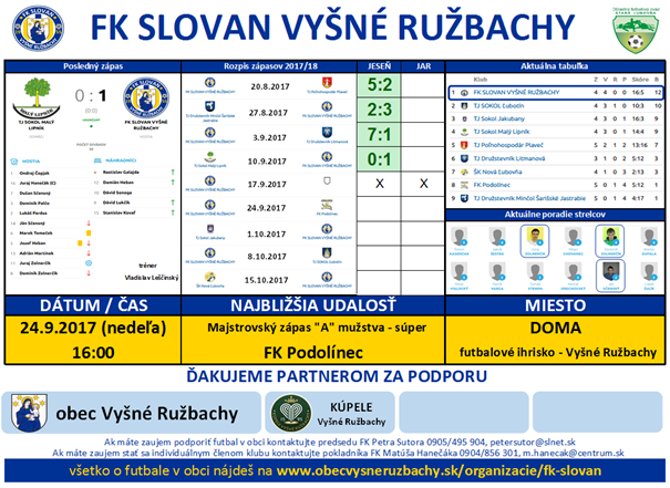 V nedeľu 24.9.2017 sa o 16:00 uskutoční DOMA na futbalovom ihrisku vo Vyšných Ružbachoch zápas 6.kola proti FK Podolínec. Na derby pozývame všetkých priaznivcov futbalu. Veríme,že naši hráči potvrdia aktuálne 1.miesto v tabuľke 6.ligy OFZ SL. Pred začiatkom stretnutia budú odovzdávané plakety ďalším čestným členom.
